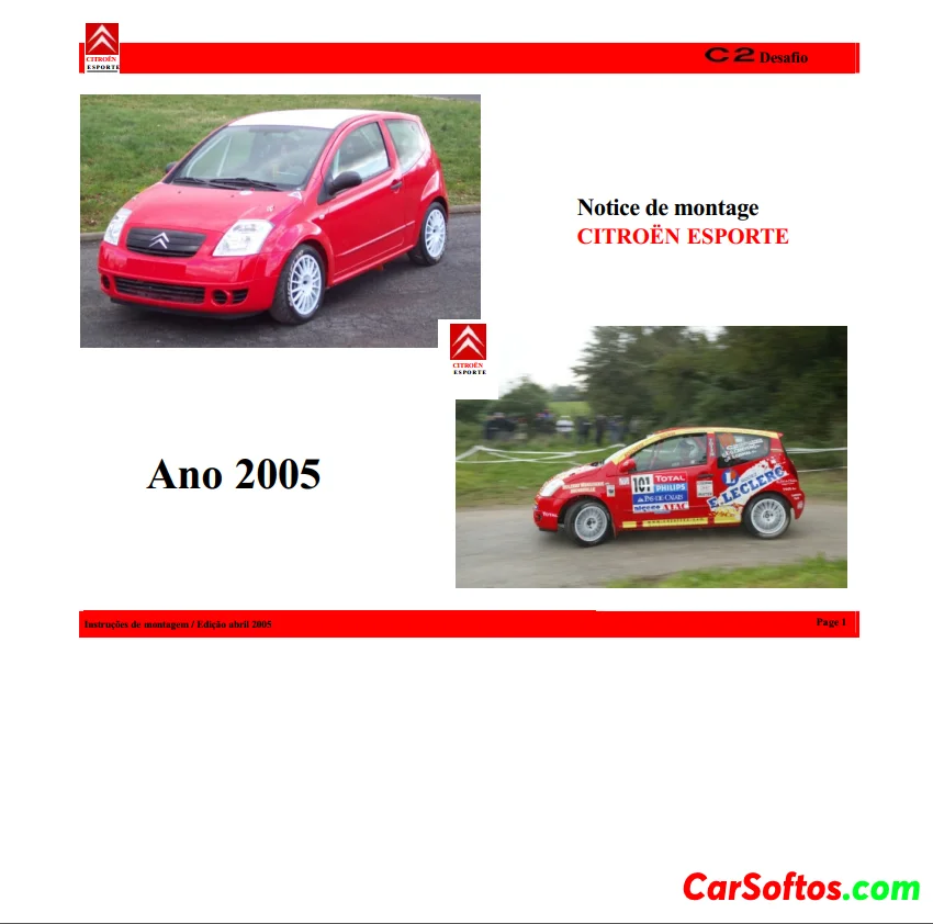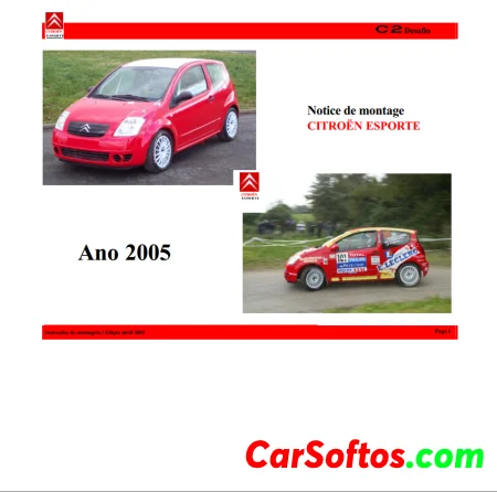 O documento é um manual de montagem para o veículo CITROËN ESPORTE, edição de abril de 2005, que fornece instruções detalhadas sobre regulamentações, montagem e manutenção de várias partes do veículo. Ele inclui informações sobre a estrutura, motor, transmissão e ligação ao solo, além de requisitos obrigatórios para a conformidade do veículo. O manual também lista contatos para suporte técnico e venda de peças de competição.