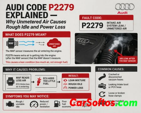 On Audi/VW applications, P2279 / 008825 means “Leak in Air Intake System.” Ross-Tech describes the common symptoms as the MIL being active, and lists likely causes including a vacuum leak, intake manifold runner position out of specification, and a faulty PCV system or heating element (N79).