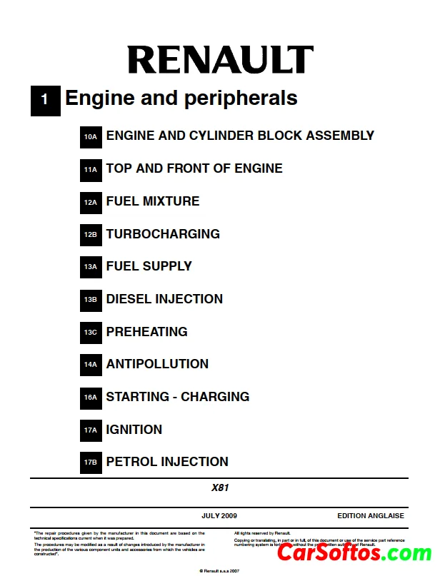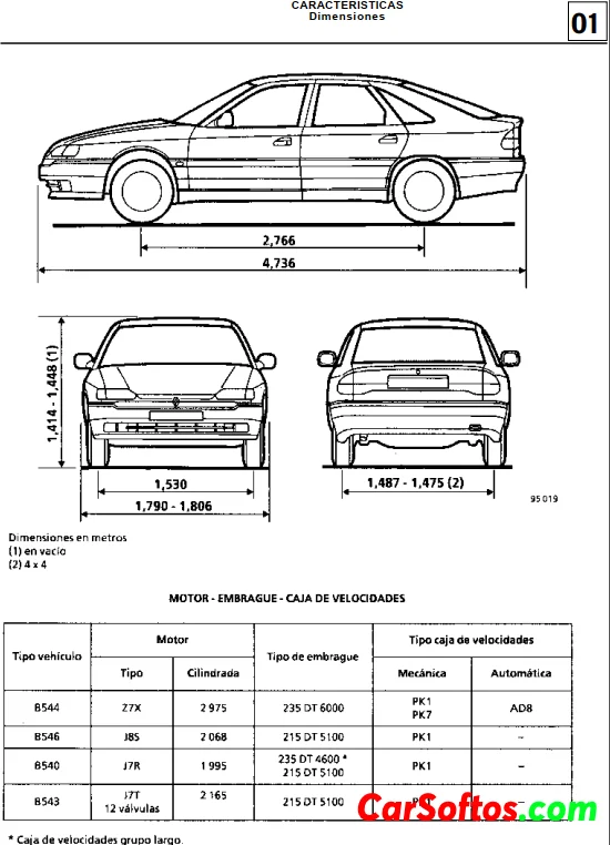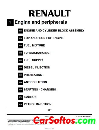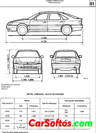 Manual Técnico Renault Safrane - El documento describe las características y componentes de varios tipos de vehículos. Incluye secciones sobre dimensiones, medios de levantamiento, lubricantes, vaciado y llenado de fluidos, conjuntos de motor, correas y juntas, y sistemas de alimentación de combustible como la carburación. Proporciona detalles sobre la identificación, precauciones y mantenimiento requerido para diferentes motores y componentes del vehículo.
