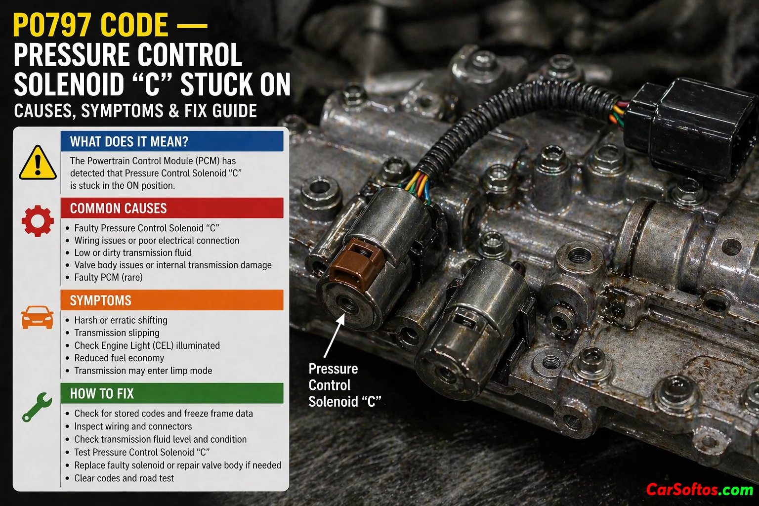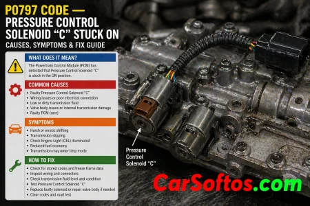 P0797 means Pressure Control Solenoid “C” is stuck on. In practice, the transmission controller commands pressure control through solenoid C, but the hydraulic response stays on when it should not, or line pressure does not follow the expected control strategy. Generic references describe it as a mismatch between commanded and actual pressure control behavior.