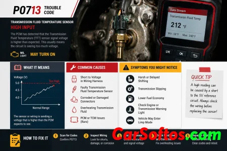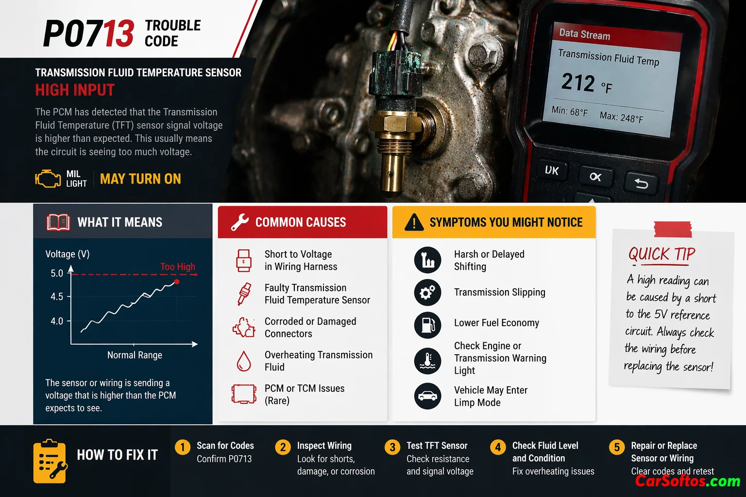 P0713 is the generic OBD-II code for Transmission Fluid Temperature Sensor “A” Circuit High Input. OEM-style service material uses that definition consistently, and Toyota transmission diagnostics place P0713 in the same family as P0711 and P0712, but specifically as the high-input version of the transmission fluid temperature sensor fault.