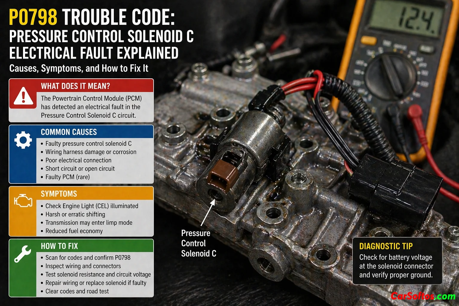 P0798 means Pressure Control Solenoid “C” Electrical. Toyota-style OEM service material for this code family uses the electrical-fault wording when the controller detects an open or short circuit in the solenoid path. One Toyota/Lexus document for the related pressure-control-solenoid C electrical fault states that when an open or short circuit occurs in the solenoid circuit, the ECM detects the issue, stores the code, and activates a fail-safe strategy.