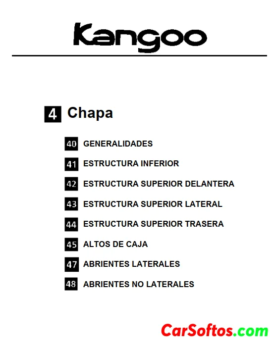 Este documento proporciona información general sobre las dimensiones, motorizaciones, equipamientos, identificación, medios de levantamiento y remolcado de un vehículo Renault Kangoo 1.6. Incluye detalles sobre la simbolización de métodos de reparación y la designación de piezas de recambio.