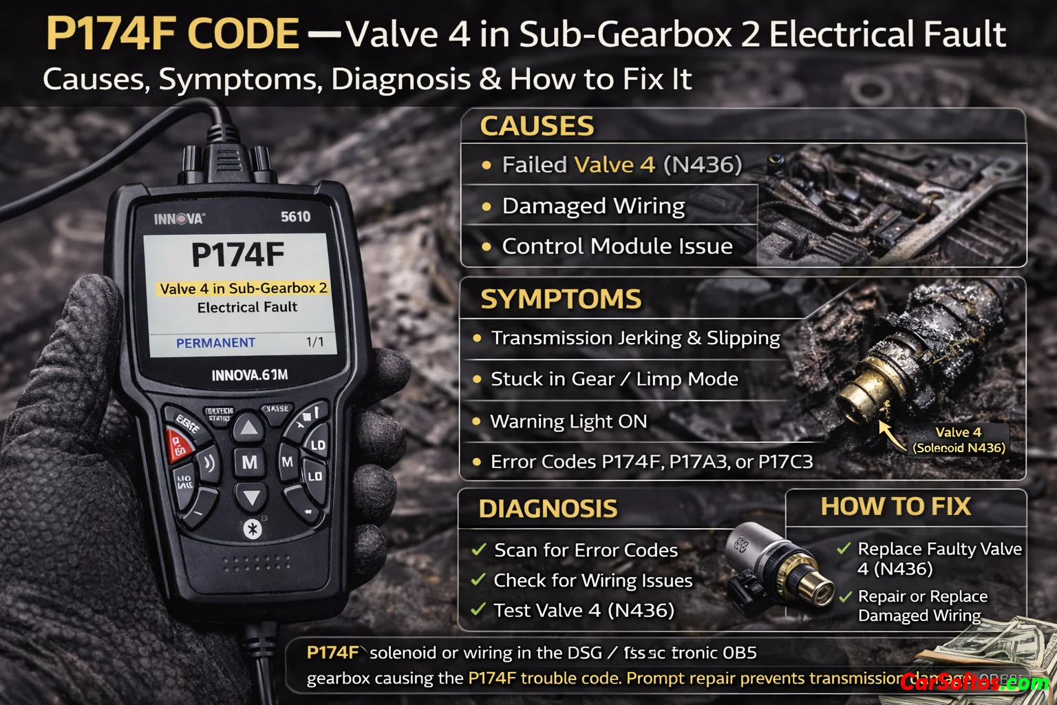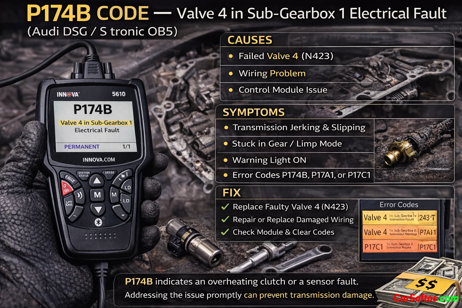 P174B is a manufacturer-specific transmission code, not a generic engine OBD-II code. In Audi documentation for the 0B5 / DL501 7-speed S tronic, it is listed as “Valve 4 in the sub-gearbox 1, electric fault”, commonly with symptom code 8027. Audi TSBs group it with other 0B5 mechatronic faults such as P174F, P179C, P17D8, and P1740.