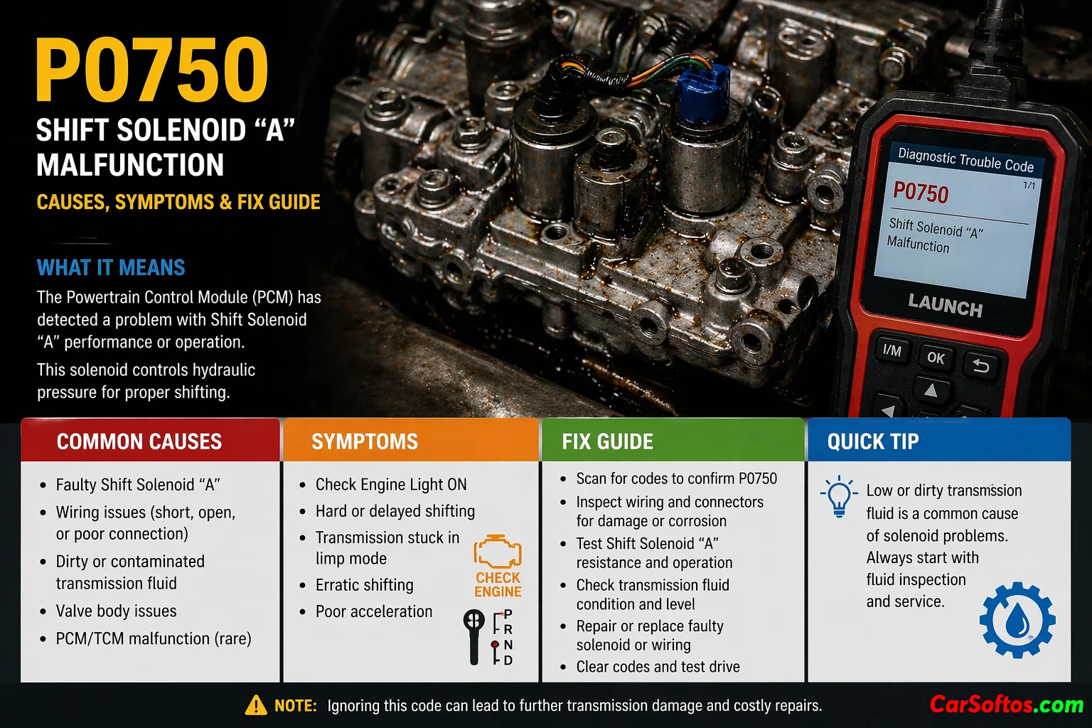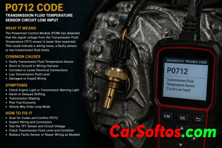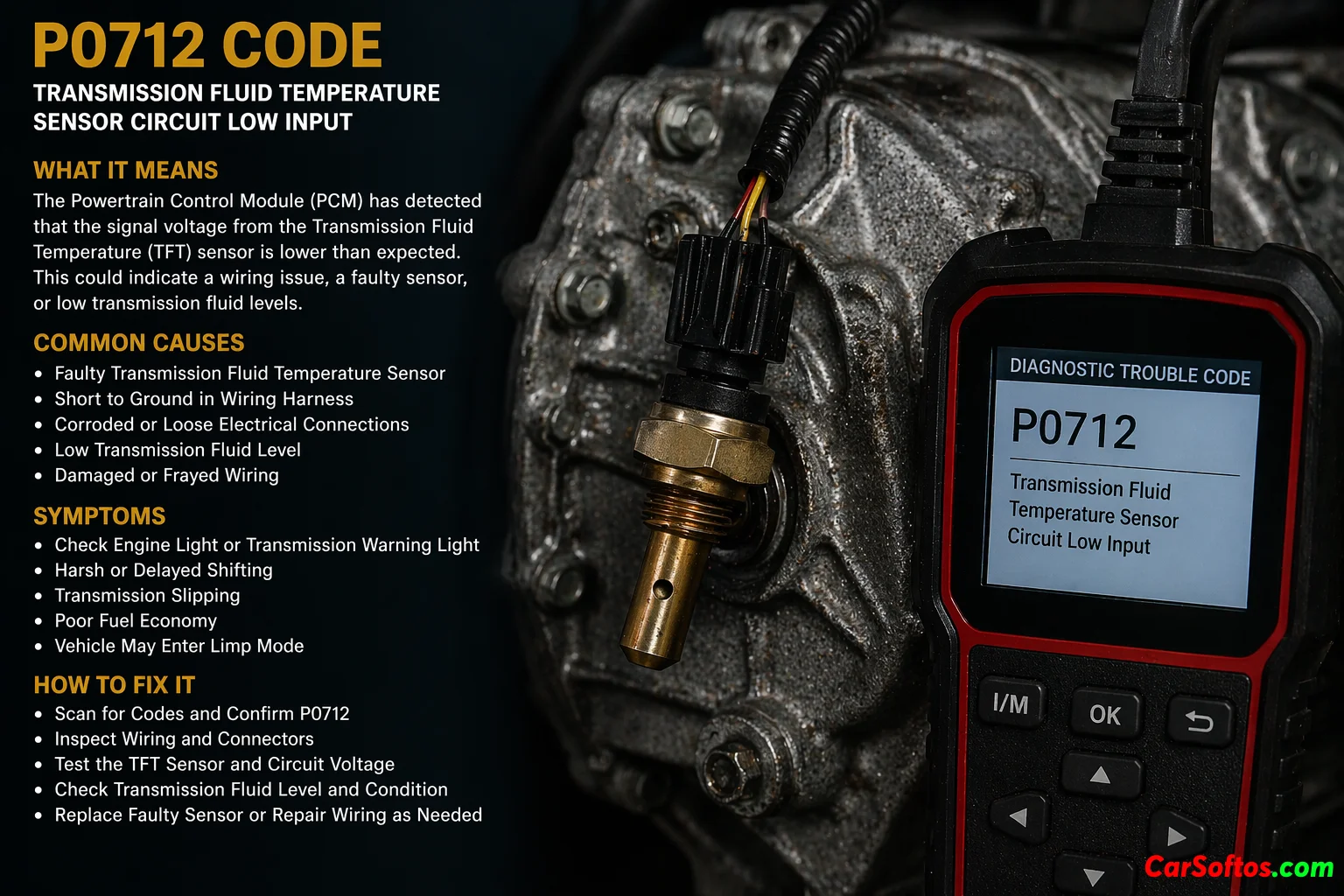 P0712 is the generic OBD-II code for Transmission Fluid Temperature Sensor “A” Circuit Low Input. OEM service information and training material use that definition consistently, and Toyota-style diagnostics specifically identify P0712 as the low-input version of the transmission temperature sensor fault family.