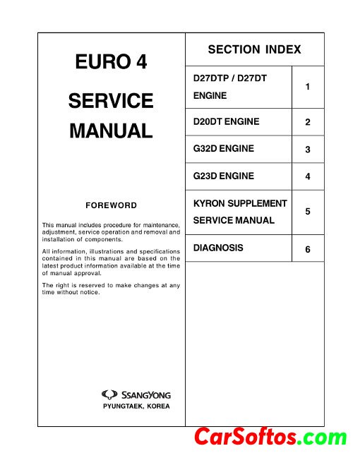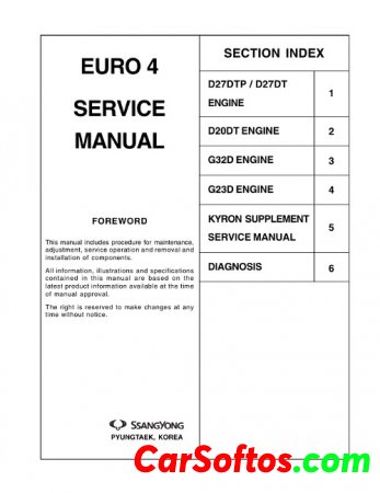 Description: Repair manual for D27DTP, D27DT, D20DT, G32D, G23D diesel engines installed on the entire SsangYong range. Used in dealerships.