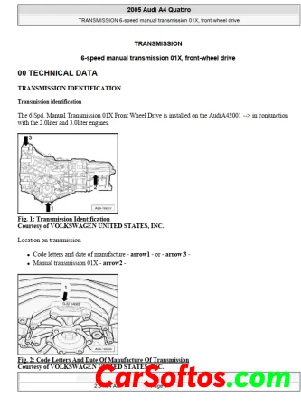 6-speed 01X manual transmission installed in the 2005 Audi A4 Quattro. It includes details about the transmission identification, layout, gear ratios, and general repair instructions. The transmission is a front-wheel drive unit with 6 forward gears and 1 reverse gear. Information is provided on determining the transmission code, ratios, specifications, and how to calculate the overall gear ratio. Proper tools and cleanliness are emphasized for transmission repairs.