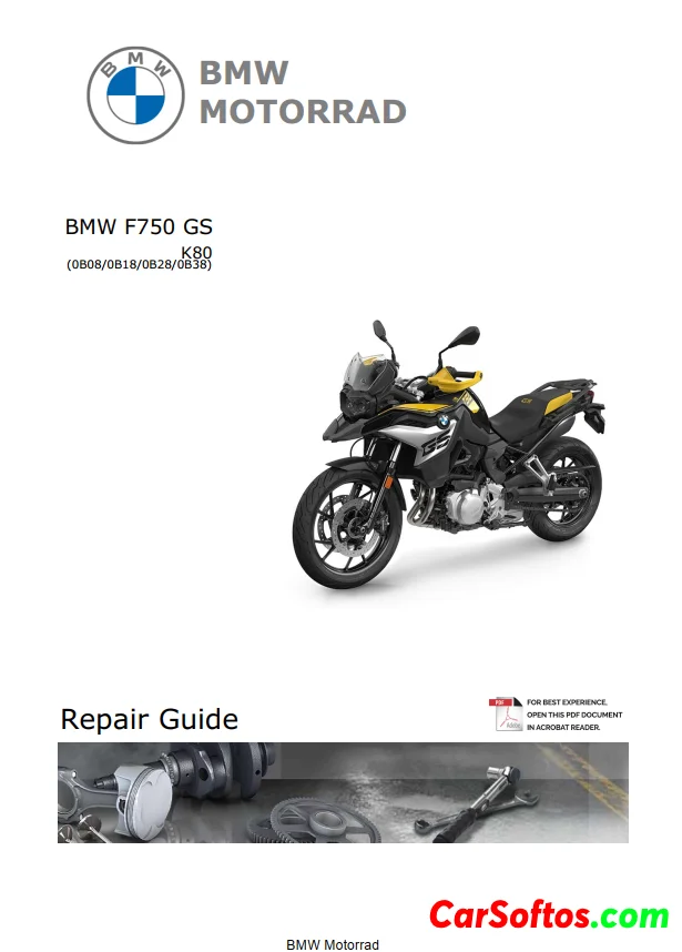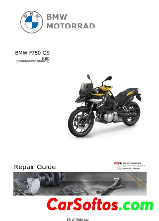 Technical specifications and repair information for BMW's F750 GS motorcycle, including: - Engine specifications such as displacement, compression ratio, torque, and maximum engine speed. - Identification information for engine, crankshaft, connecting rod, piston, and counterbalance shaft components. - Clearance, play, and wear limit measurements for engine parts. - Color coding and labeling schemes used to identify bearing shells and assemblies during disassembly and reassembly. - Capacity and specification information for engine oil.