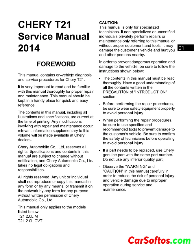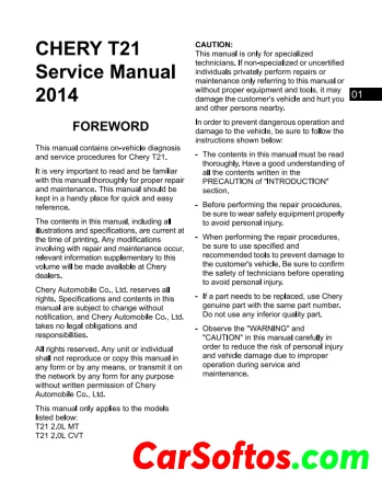 2014 CHERY T21 Service Repair Manual PDF. This manual contains on-vehicle diagnosis and service procedures for Chery T21. It is very important to read and be familiar with this manual thoroughly for proper repair and maintenance. This manual should be kept in a handy place for quick and easy reference.