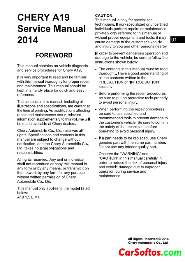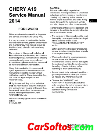 2014 Chery A19 Service and Repair Manual. This manual contains on-vehicle diagnosis and service procedures for Chery A19.