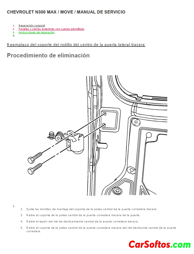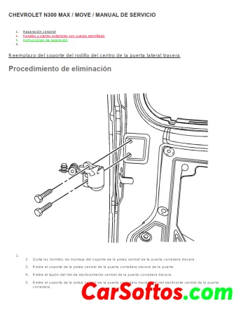 Este manual de servicio describe los procedimientos para reemplazar varias partes de una puerta lateral trasera de automóvil, incluidos los soportes de los rodillos, el parachoques, el cable de liberación de la tapa del motor y la cubierta del riel central de la puerta. También incluye instrucciones para reemplazar la puerta lateral delantera y la puerta corredera trasera completas.