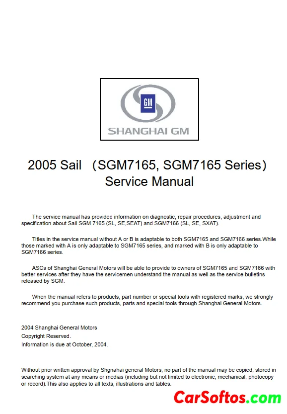 2005 Sail (SGM7165, SGM7166 Series) service manual has provided information on diagnostic, repair procedures, adjustment and specification. Titles in the service manual without A or B is adaptable to both SGM7165 and SGM7167 series. Owners of these vehicles are welcome to feedback their concerns to Customer Support Centers of SGM.