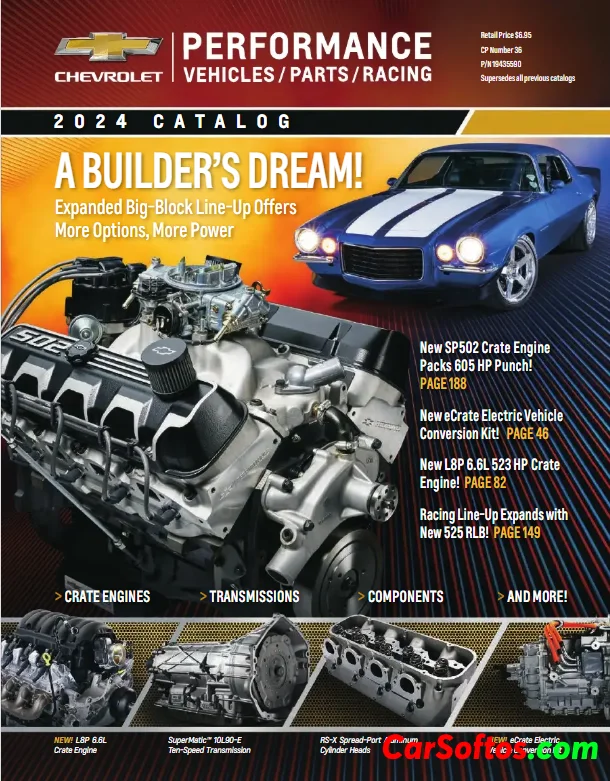 This catalog from Chevrolet Performance provides information on crate engines, transmissions, components and other products. It highlights several new offerings for 2023 including the new SP502/605 Deluxe crate engine, L8P 6.6L crate engine, 525 RLB racing crate engine, and eCrate electric vehicle conversion kit. The catalog contains specifications, features and pricing information for a wide range of performance parts and is intended for racing, off-road and other non-street applications.