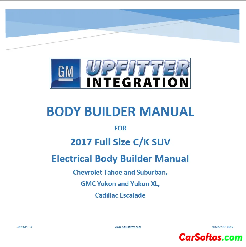 2017 Electrical Body Builder Manual for the Chevrolet Tahoe and Suburban, GMC Yukon and Yukon XL, and Cadillac Escalade. It provides information on vehicle identification numbers (VIN), engine identification, and transmission identification locations. The VIN plate is located on the upper left corner of the instrument panel and contains 17 characters that identify attributes like country of origin, manufacturer, model, and model year. Engine and transmission identification tag locations are also referenced.