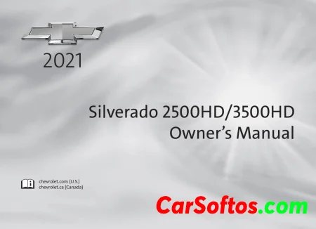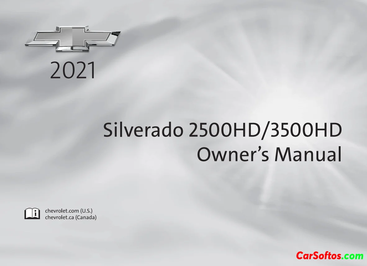 Owner's manual for the Chevrolet Silverado 2021 - 2500 HD/3500 HD. It contains information about keys, doors and windows, seats and restraints, storage, instruments and controls, lighting, the infotainment system, climate controls, driving and operation, vehicle care, service and maintenance, technical data, customer information, safety defects, OnStar, and connected services. The manual is published by GM and is intended to inform owners about operating the vehicle safely and maintaining it properly.