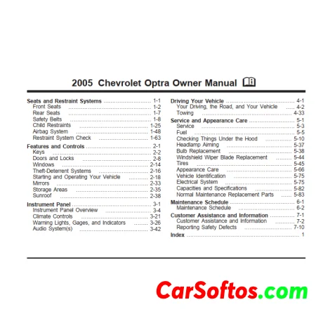 This owner's manual provides information about operating and maintaining a 2005 Chevrolet Optra. It covers topics such as seat and restraint systems, features and controls, instruments and controls, driving instructions, maintenance, and specifications. The manual contains sections about safety belts, airbags, child restraints, seats, mirrors, windows, doors, theft deterrent systems, climate controls, audio systems, and more.