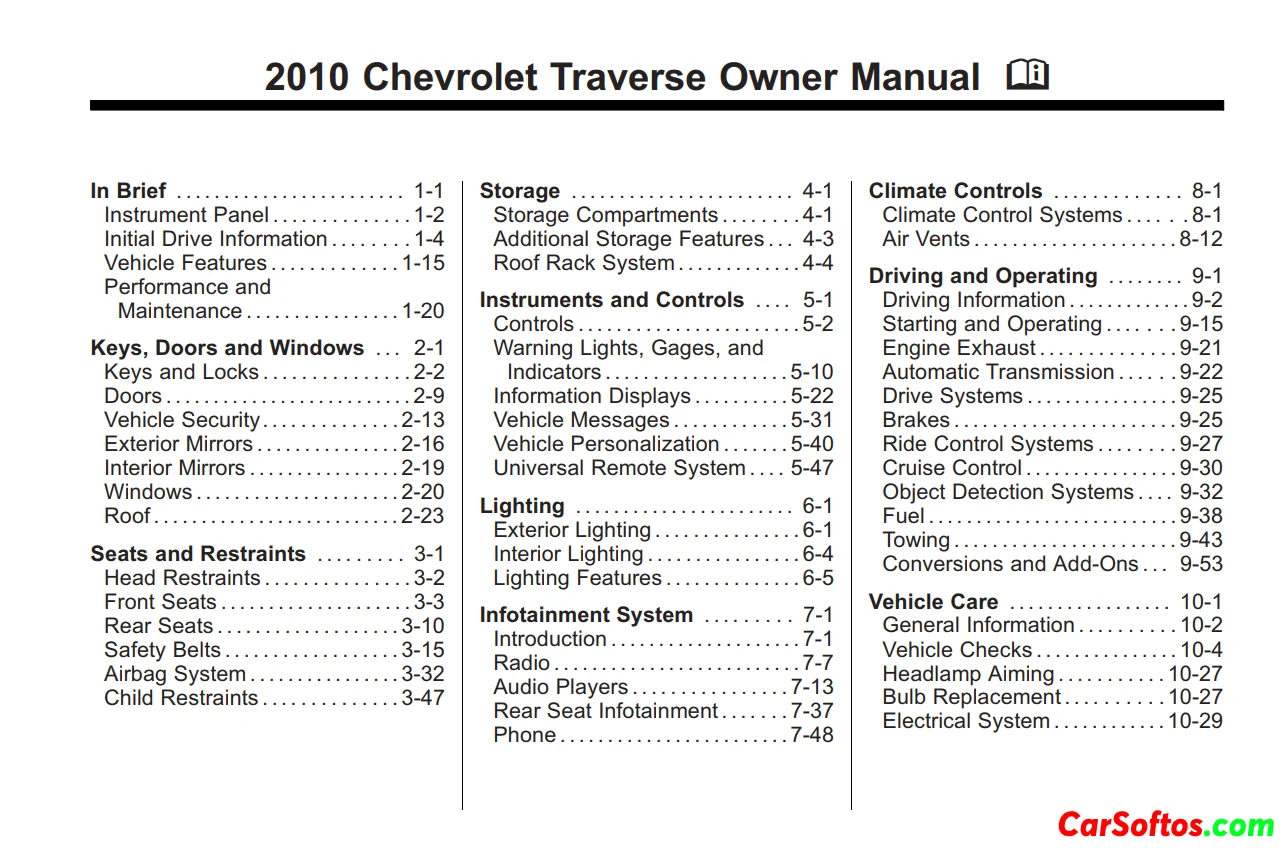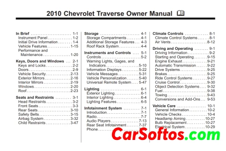 Chevrolet Traverse 2010 Owner Manual. It provides information about the vehicle's features, controls, instruments, warning lights, maintenance schedules, and more. The manual is organized into sections covering keys and locks, seats and restraints, climate controls, driving instructions, vehicle care, and more. It aims to familiarize owners with the vehicle and provide operating instructions.