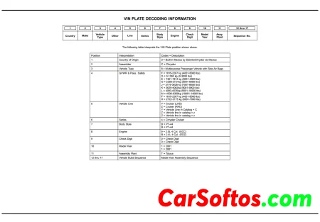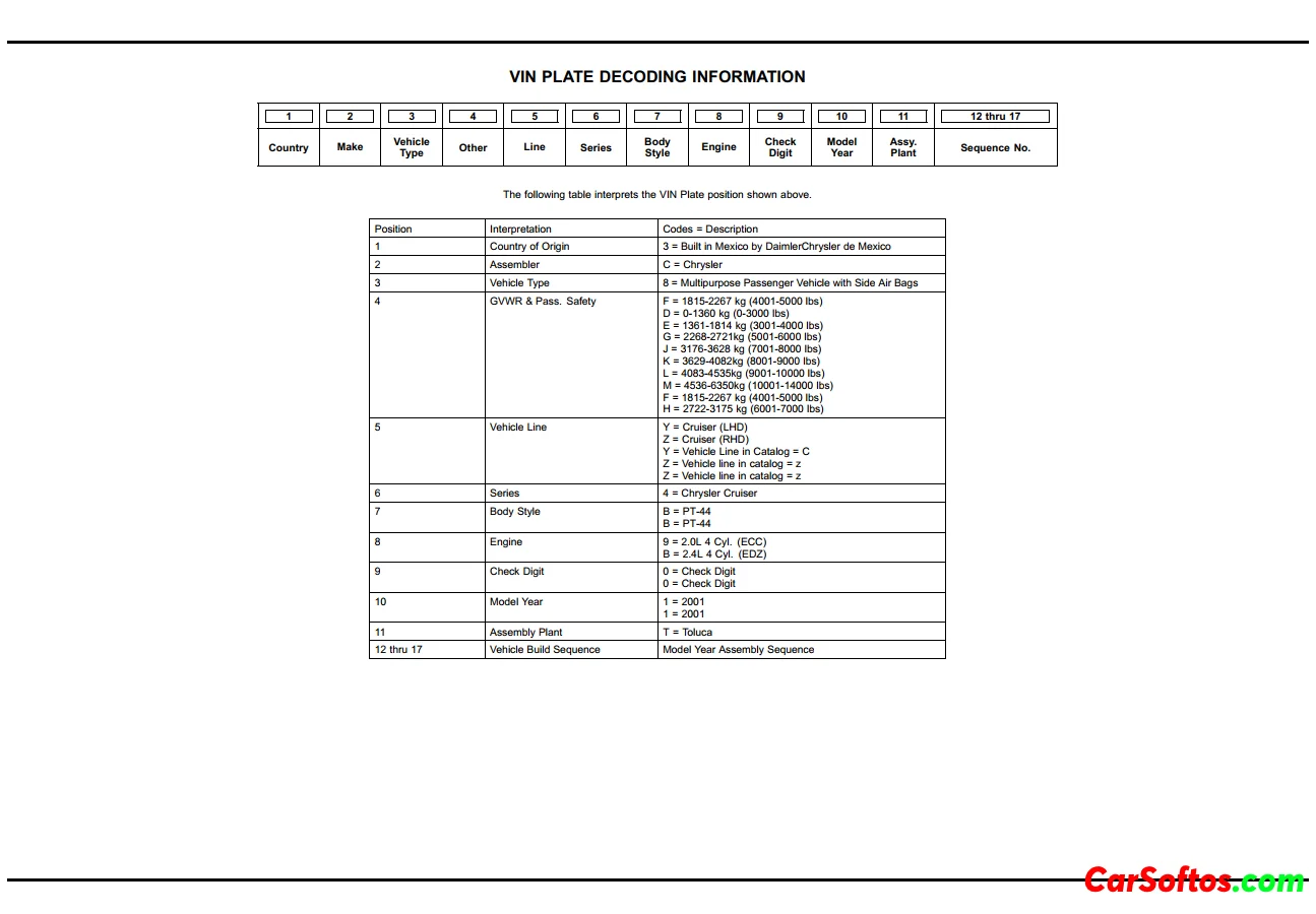 Information on decoding a vehicle identification number (VIN) plate, including what each position in the VIN represents. It then gives an example VIN plate breakdown, interpreting the codes in each position, such as the country of origin being Mexico and the vehicle type being a multipurpose passenger vehicle. It also includes an illustration and part numbers for a navigation kit that can be installed as an accessory for the 2001 PT Cruiser.