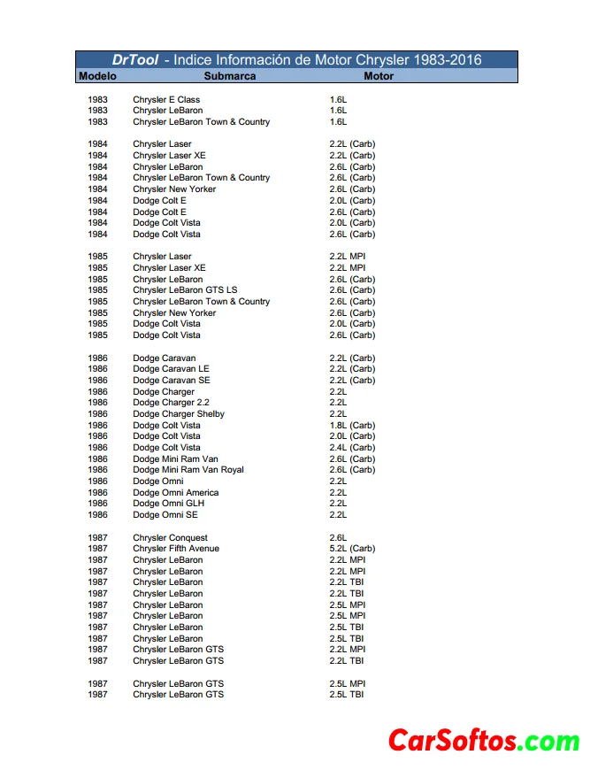List of Chrysler and Dodge vehicles from 1983 to 1987 along with their corresponding engine specifications. It includes models such as the Chrysler LeBaron, Dodge Colt, Dodge Dakota, and Dodge Ramcharger. For each vehicle, the year, model name, sub-brand and engine size in liters are provided. The list contains over 500 entries and provides detailed engine information for Chrysler and Dodge cars and trucks sold during this five year period.