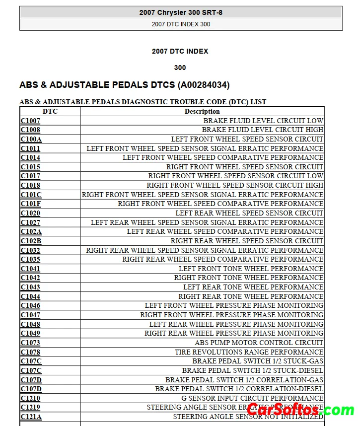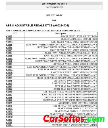 List of diagnostic trouble codes (DTCs) for the 2007 Chrysler 300 SRT-8. It includes DTCs for the ABS and adjustable pedals system, with codes related to wheel speed sensors, tone wheels, brake pressure sensors, and more. It also lists audio/video DTCs involving amplifier issues, speaker output circuits, and cabin equalization performance. The DTCs are organized with the code number, description, and grouped by system or component.