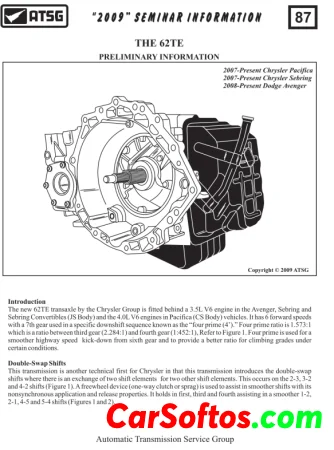 The new 62TE transaxle by the Chrysler Group is fitted behind a 3.5L V6 engine in the Avenger, Sebring and SebringConvertibles (JS Body) and the4.0L V6 engines in Pacifica(CS Body) vehicles. It has 6 forward speeds with a 7th gear used in a specific downshift sequence known as the “four prime (4′).” Four prime ratio is 1.573:1 w hich is a ratio between third gear (2.284:1) and fourth gear (1:452:1), Refer to Figure 1. Four prime is used for a smoother highway speed kick-down from sixth gear and to provide a better ratio for climbing grades under certain conditions.