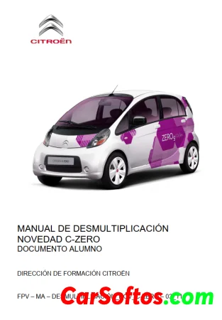 Este documento resume un manual de formación sobre el Citroën C-ZERO, un vehículo eléctrico. El manual contiene 9 capítulos que cubren temas como seguridad, componentes bajo el capó, interior del vehículo, y funcionamiento del cliente. El objetivo es capacitar al personal de posventa sobre este vehículo eléctrico, incluyendo protocolos de seguridad y componentes clave.