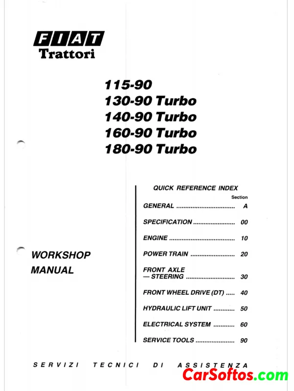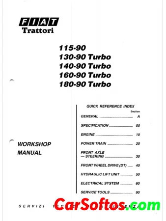 Fiat Trattori 115- 90, 130- 90 Turbo, 140- 90 Turbo, 160- 90 Turbo, 180- 90 Turbo - workshop manual for Fiat tractors, detailing specifications, engine information, and various mechanical systems. It includes a structured index for easy navigation through sections such as general instructions, engine specifications, and power train details. The manual is subject to updates and revisions, with a focus on providing accurate technical information for maintenance and repair.