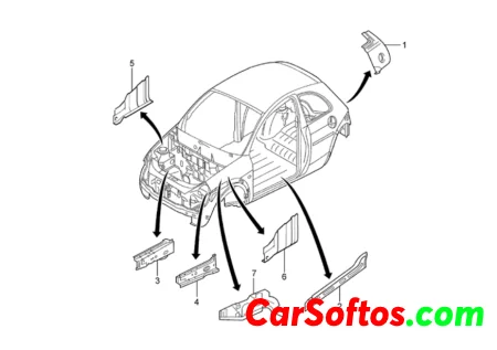 Este documento contiene tres listados de partes para un Ford Ka, incluyendo la carrocería, chapas de reparación y molduras. Cada lista detalla los códigos, descripciones, modelos aplicables y períodos de cada parte.