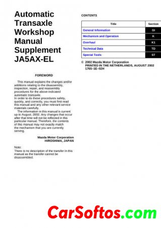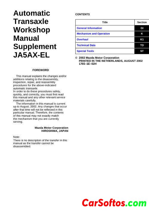 Manual for maintenance and repair of automatic transmission Mazda model JA5AX-EL.