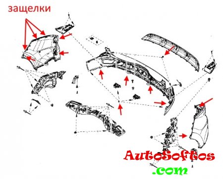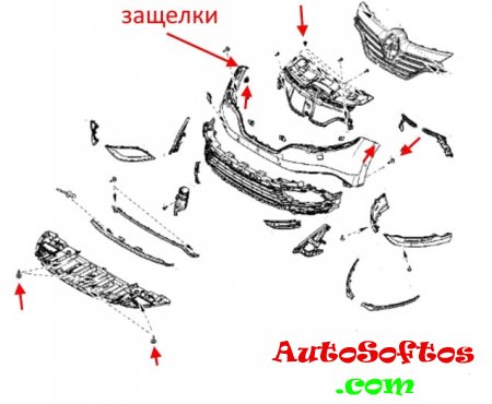 Bumper mounting diagrams. The arrows indicate screws, pins and latches.