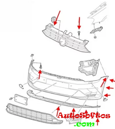 -under the hood, unscrew two screws and remove the radiator grille towards you (the bottom is held on by latches).