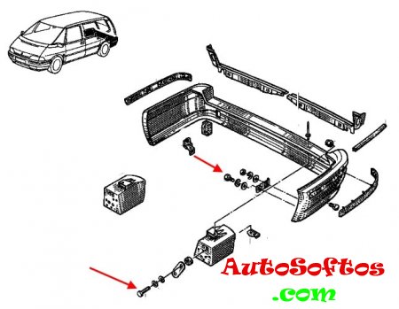Both the front and rear bumpers of the Renault Espace 2 are attached in four places. One screw on each side, attaching the sides to the fenders and two screws to the body.