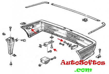 Bumper mounting diagrams. The screws are indicated by arrows.