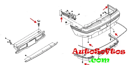 Depending on the year of manufacture and body type, the mounting locations may differ. Below are the mounting diagrams. The arrows indicate the locations of the screws.
