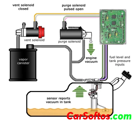 The EVAP system stores fuel vapors inside a charcoal canister and sends them back into the engine to burn.