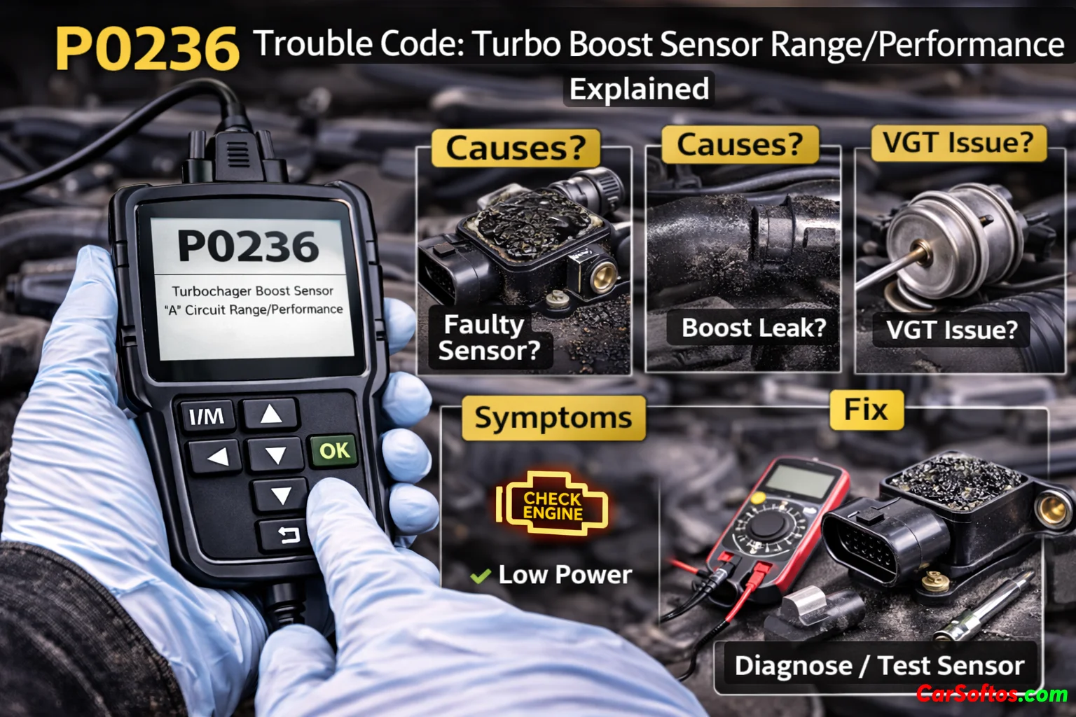 P0236 sounds like a sensor code, but Ross-Tech’s cause list shows it can also be caused by boost leaks, loose clamps, wiring faults, or actuator issues.