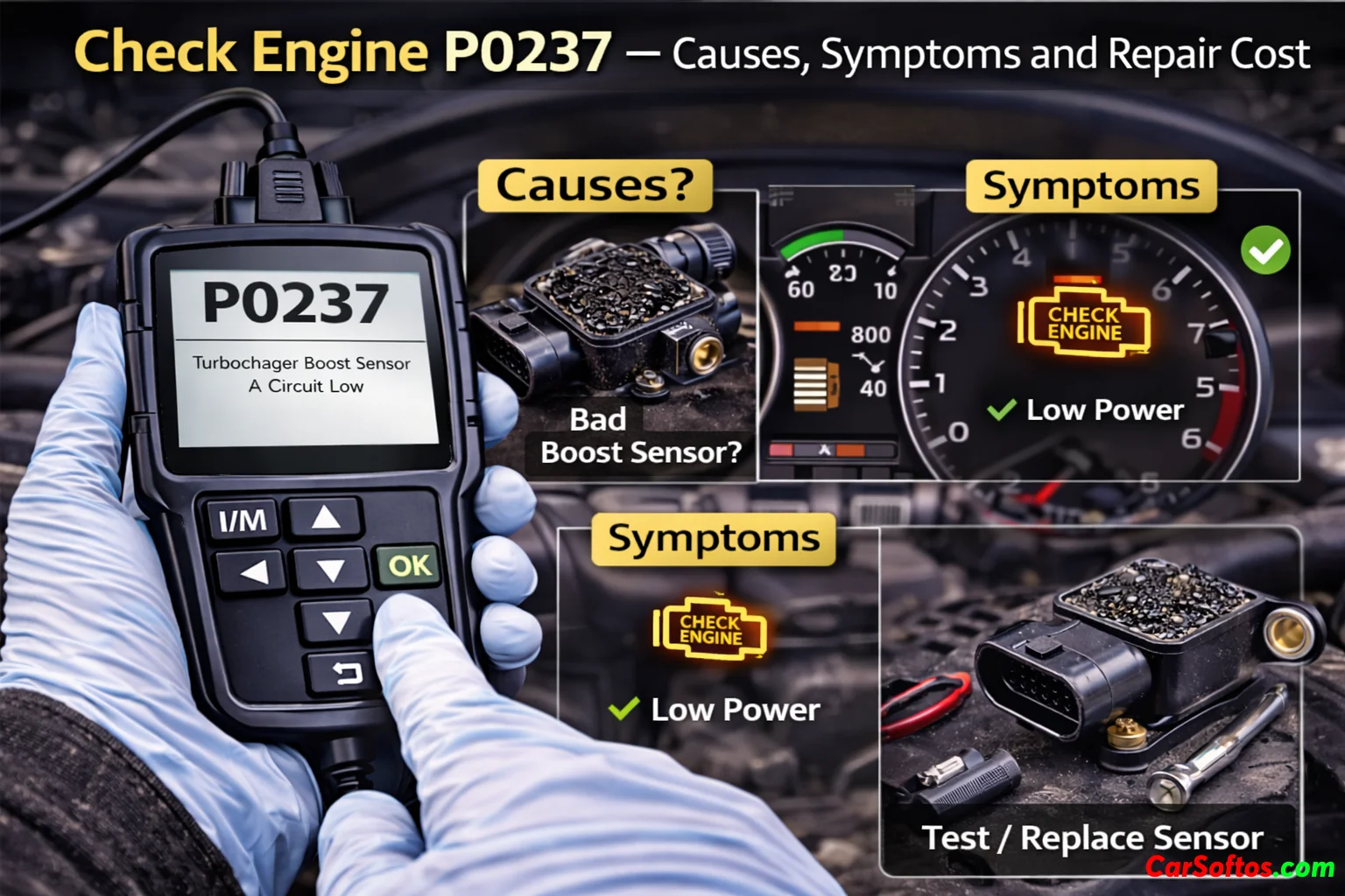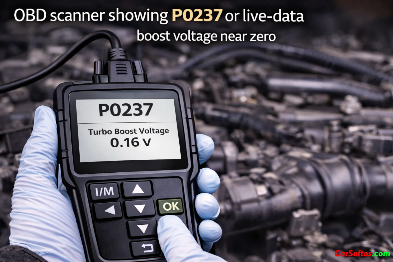 If P0237 appears with other turbo codes, that usually means the low signal is affecting overall boost control, not just the sensor line itself. That is an inference based on how these code families overlap diagnostically.