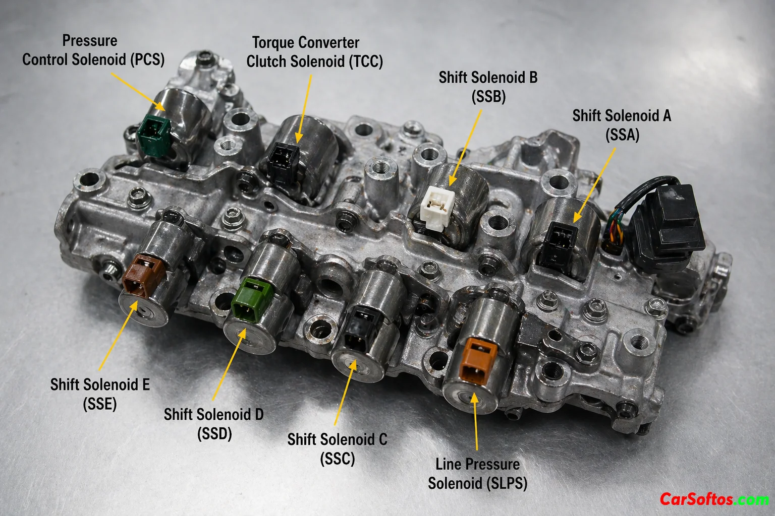 A shift solenoid is an electro-hydraulic valve inside the transmission valve body. The TCM/ECM energizes it to route hydraulic pressure to the right clutch pack or brake band so the transmission can change gears. Toyota technical material shows that when a solenoid like SL1/S1 fails, the controller may fall back to substitute gear control using the remaining solenoids, which is why some vehicles with P0750 still move but shift badly or get stuck in limited gears.