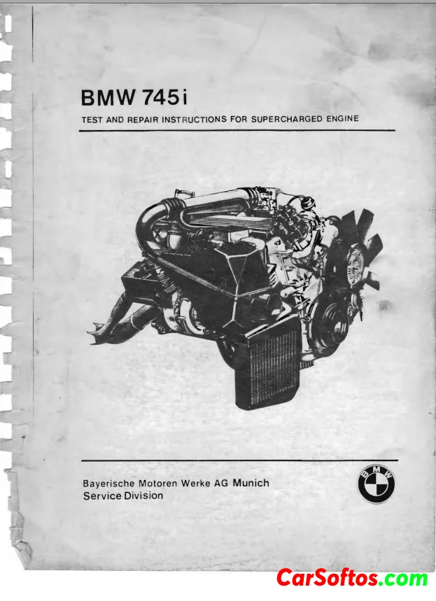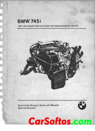 Document provides testing and repair instructions for the BMW 745i Turbo, supplementing the existing repair manual for models 728i through 735i. It details the supercharging process, specifications, and necessary tools, along with step-by-step procedures for inspections, adjustments, and repairs specific to the supercharged engine. Important safety and operational guidelines are emphasized to ensure proper maintenance and performance of the vehicle's engine components.