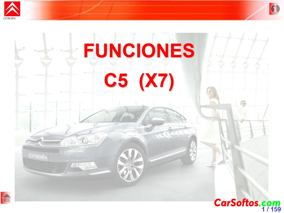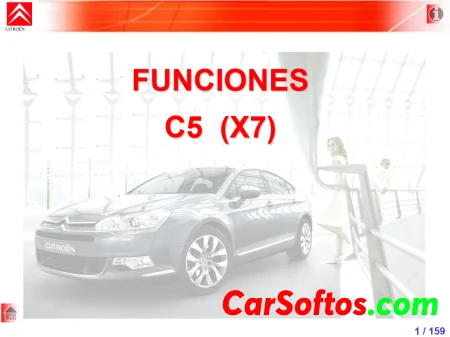 El documento describe la arquitectura eléctrica del Citroën C5 (X7), incluyendo la caja de estado de carga de la batería (BECB), las diferentes redes, las fases de vida del vehículo y la distribución eléctrica. La BECB monitorea el estado de carga de la batería y activa el modo de ahorro de energía cuando la carga cae por debajo de un cierto umbral para preservar la energía y garantizar el rearranque. La arquitectura eléctrica utiliza varias redes CAN y LIN.