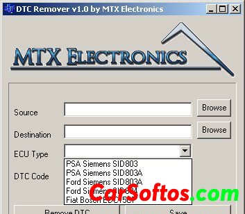 Description: The DTC Remover program is used to disable the firmware dump mask, error codes, it is used in the following controllers: PSA Siemens SID803 PSA Siemens SID803A Ford Siemens SID803A Ford Siemens SID804 Fiat Bosch EDC15C7