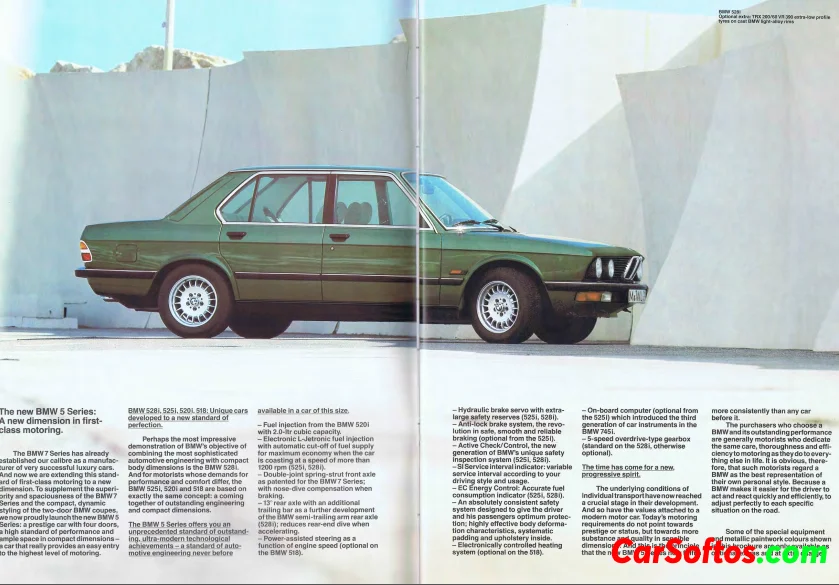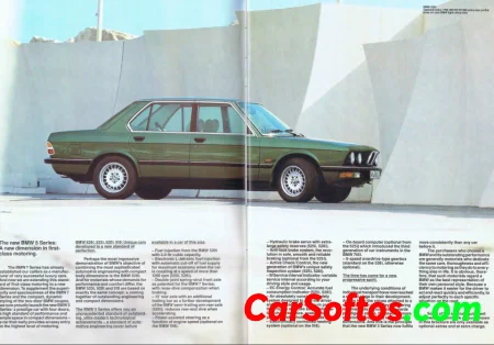 BMW 5 Series cars, including the 518, 520i, 525i, and 528i models. It provides details on the features, specifications, and engineering of the 5 Series, positioning it as a prestigious car that provides both performance and ample interior space. The 5 Series introduces a new segment that is a step up from medium cars but not as large as a luxury car.