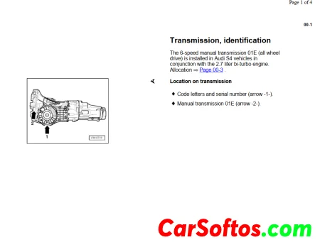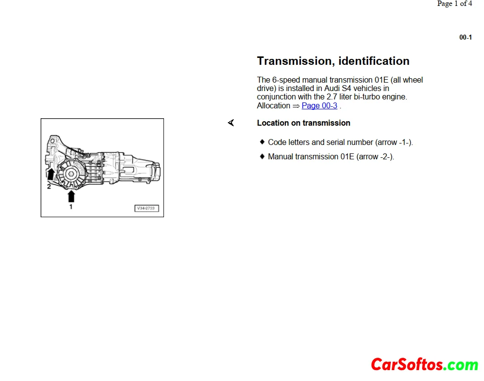 The 6-speed manual transmission 01E (all wheel drive) is installed in Audi S4 vehicles in conjunction with the 2.7 liter bi-turbo engine.