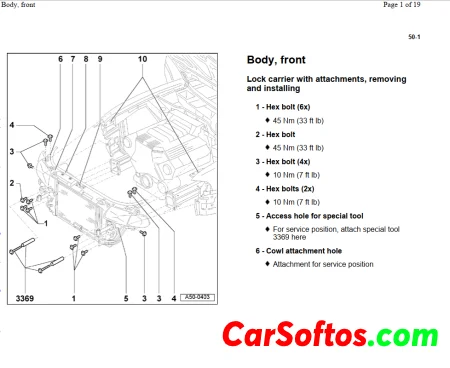 This document provides instructions for removing and installing the lock carrier on Audi vehicles. Key steps include: - Removing the bumper, noise insulation panel, hood lock cable, coolant hoses, condenser, hydraulic oil cooler, and intake air duct. - Loosening seals and removing bolts to detach the lock carrier from the fenders. - Placing the lock carrier in a service position by screwing in a special tool and securing it with screws. - Reinstalling involves following the removal steps in reverse order and adjusting headlight positioning.