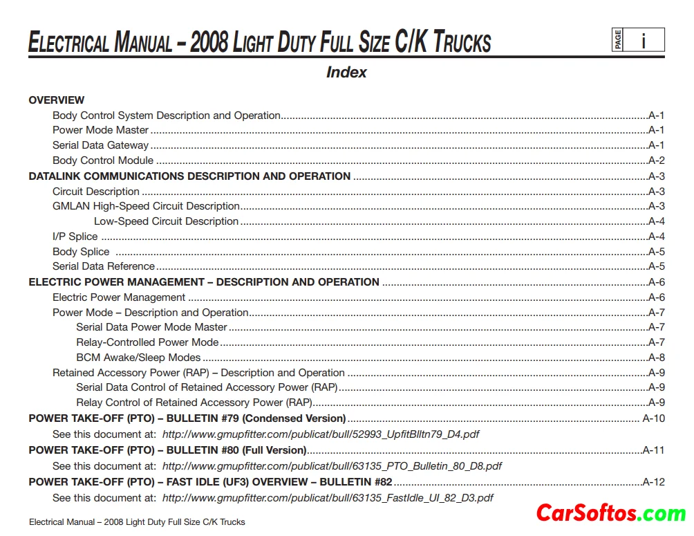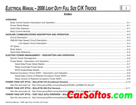 This document provides information on the electrical control system for 2008 C/K trucks. Data communications, power management, PTO functions, and snow removal equipment installation capabilities are described.