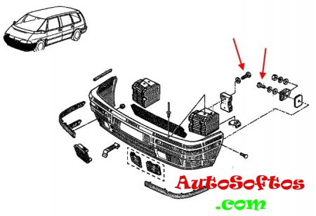 Both the front and rear bumpers of the Renault Espace 2 are attached in four places. One screw on each side, attaching the sides to the fenders and two screws to the body.
