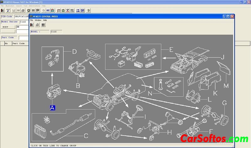 Description: An image of a virtual machine with an electronic spare parts catalog for NISSAN and Infinity cars. The Nissan FAST program allows you to determine the numbers of original parts from the manufacturer (Part Number). Additionally, there is the possibility of determining the number of the original part for replacement from the manufacturer (Alternate Part Number).