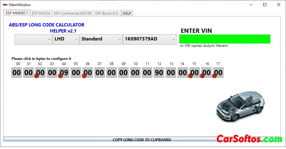 ABS ESP Long Code Calculator Helper 2.1 is an advanced software for car enthusiasts and professional mechanics. Its main purpose is to facilitate the calculation of ABS long coding for 18- and 19-byte MK60EC1 types used by Audi, Seat, Skoda and Volkswagen among others.