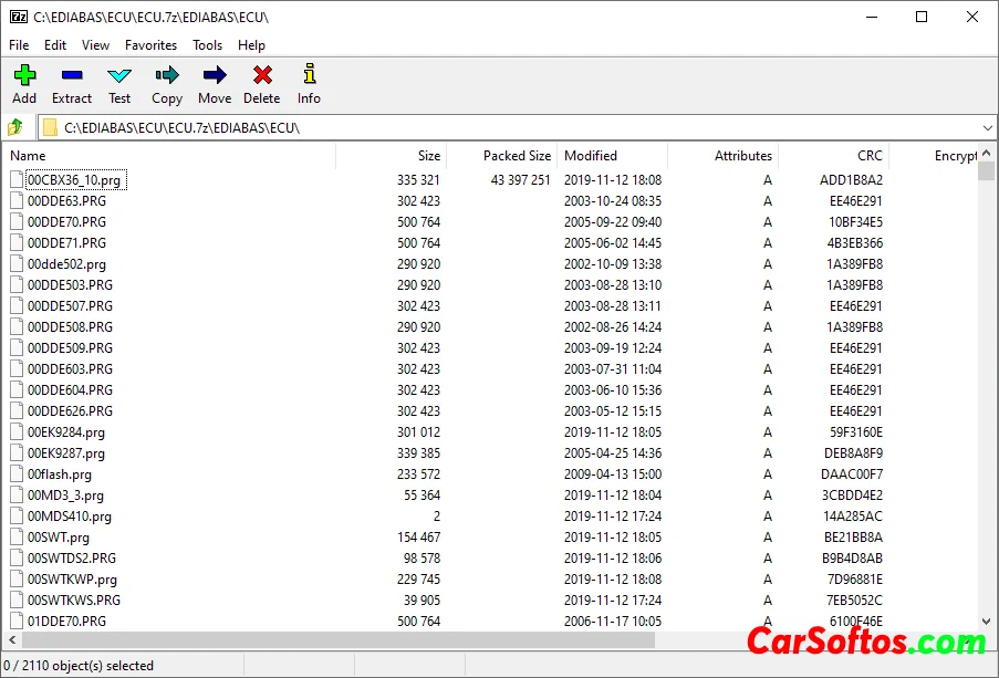 Description: Collection of SGBD files required to send UDS messages (ISO 14229) to BMW/Mini ECUs via EDIABAS ToolSet32 (Tool32) and to run other BMW programs. Tool32 is installed separately, together with EDIABAS, which is included in the BMW Standard Tools software package. The archive contains 2110 files (2033 unique) in *.prg format, the unpacked volume is about 1.47 GB. 42 files have 77 copies with different names, but with the same checksums. The PRG_list.txt file contains a CSV list of all archive files with checksums.